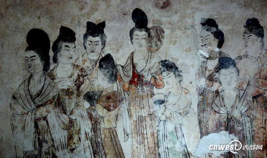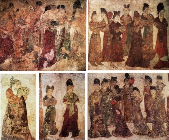 从墓道到墓室还绘有丰富多彩的壁画,有宫廷仪仗队,以及天体图、宫女图等。尤其是墓室中放置的一具石椁,石壁上线刻着15幅画面的仕女人物画,其造型之美,实为罕见。在这些人物中,有的上着披贴、下穿长裙;有的身着男装;有的身穿长褂,腰束锦带,带上缀有荷包;有的脚穿如意鞋;有的身着短袄长裙……或捧壶,或托盘,或弄花,或拱手,或对话等等,所有这一切均展现了当时宫廷生活的情景。此外,石椁两扇门的顶部,还刻着一对鸳鸯,张开羽翼,相向飞舞,象征着墓内主人夫妻恩爱。